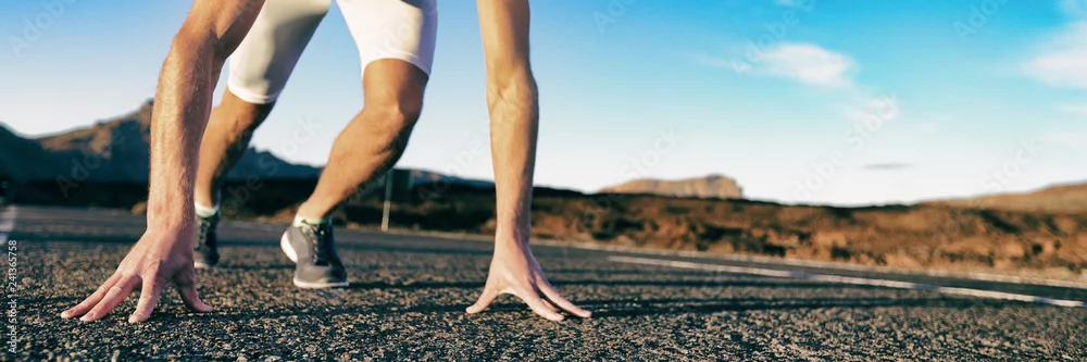 Start athlete ready to run competition waiting for starting sprinting. Fitness challenge for new year -banner panorama. Ready for success.