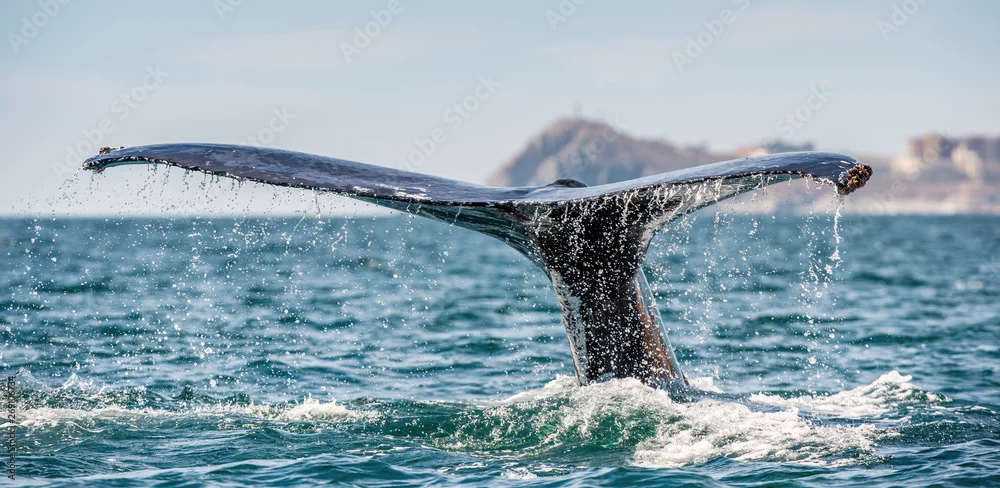 Tail fin of the mighty humpback whale above surface of the ocean. Scientific name: Megaptera novaeangliae. Natural habitat. Pacific ocean, near the Gulf of California also known as the Sea of Cortez.