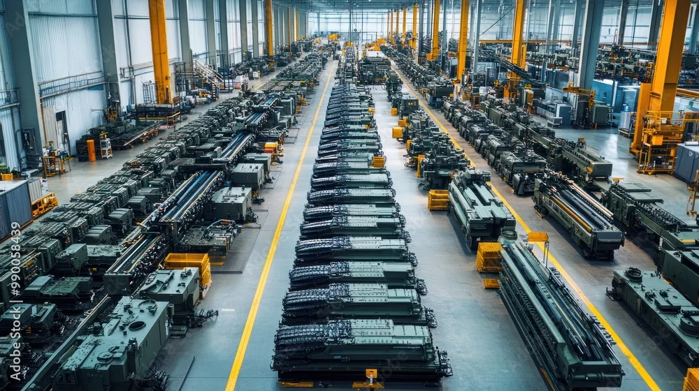 The arms industry in full production, with rows of military equipment and weapons being manufactured, showing the scale of defense manufacturing.