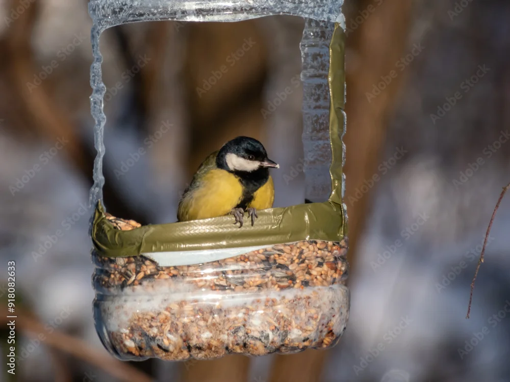 The Great tit (Parus major) visiting bird feeder made from reused plastic bottle full with grains in winter. DIY plastic bird feeder bottle hanging in the tree