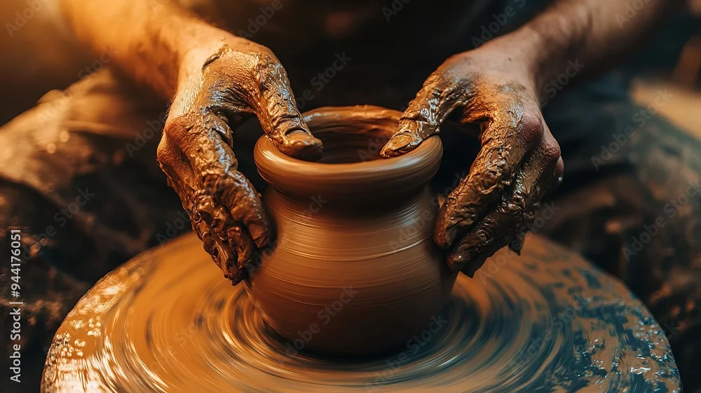 The hands of a potter pulling the walls of a clay product on a potter's wheel. Ceramist masters pottery in the workshop. copy space for text.