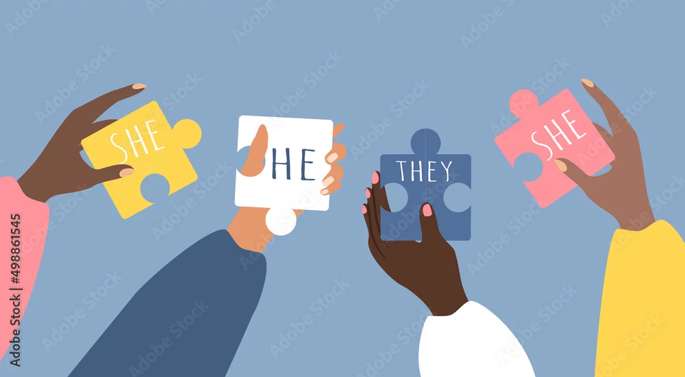 vector illustration on the theme of gender diversity, people with non-binary gender identity, transgender people. Hands of people of different races holding puzzle pieces with pronouns