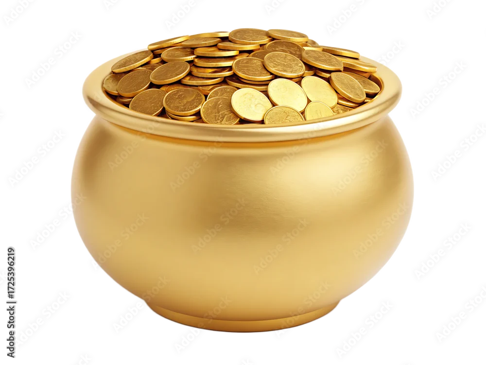 A golden pot overflowing with shiny gold coins against a black isolated background image view