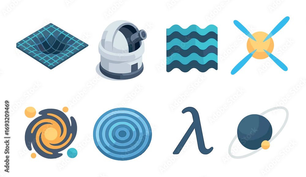 Space science flat icons set. featuring black hole, telescope, waves, sunburst, galaxy, target, lambda, planet.