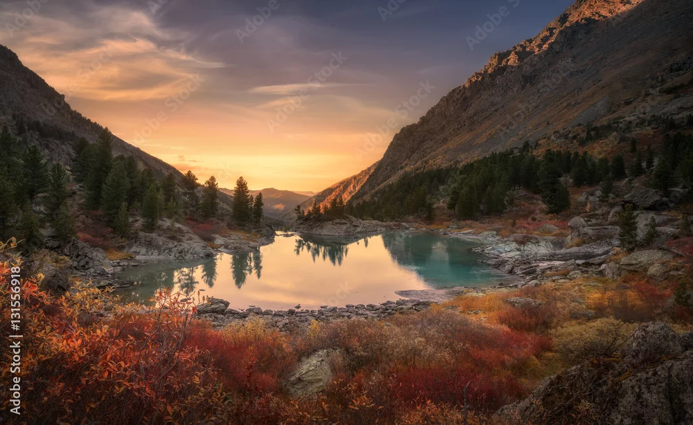 Pink Sky And Mirror Like Lake On Sunset With Red Color Growth On Foreground, Altai Mountains Highland Nature Autumn Landscape Photo