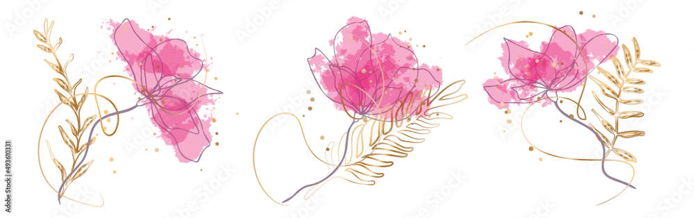 Watercolor floral illustration set - grasses, ferns and leaves for your own design. Gold ribbons and splashes. Wedding stationery, greeting cards, wallpaper ...