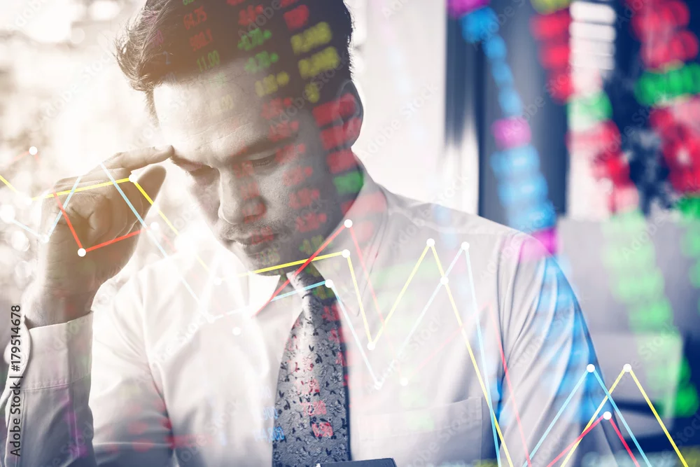 BUSINESS MAN with stress action in office with double exposure with business graph chart financial concept