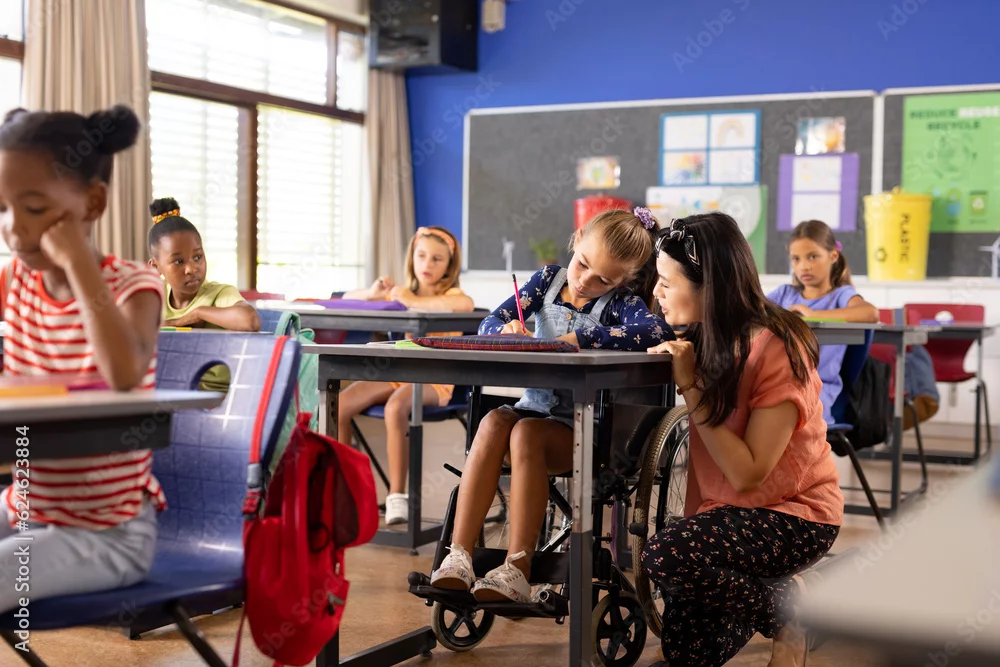 Diverse female teacher and schoolgirl in wheelchair in elementary school class