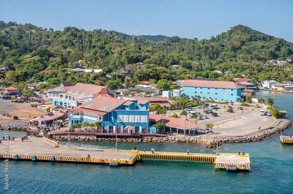 Roatan, Honduras - March 30, 2023: Cruise port facilities at Roatan, Honduras.