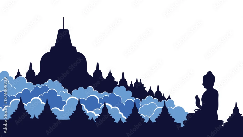 Silhouette of the majestic Borobudur temple complex in Indonesia with blue clouds and a peaceful Buddha statue on a bright white background.