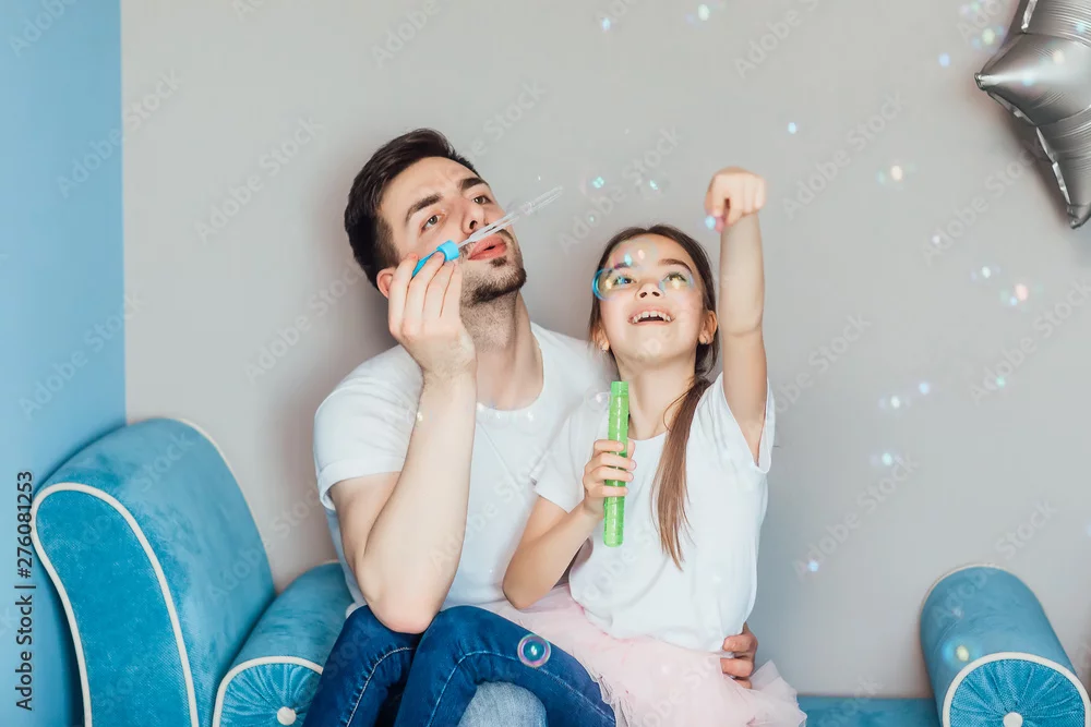 Happy father with daughter blowing bubbles at home, candid emotions.