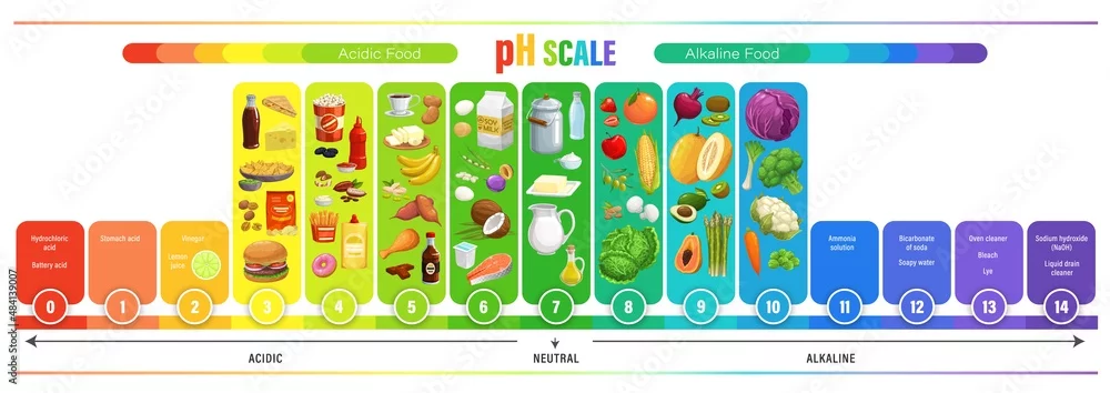 PH scale chart, acid balance of nutrition measure meter and food chemistry science infographics. Food acidity laboratory test scale with fast food meal and drink, dairy products, fruits and vegetables