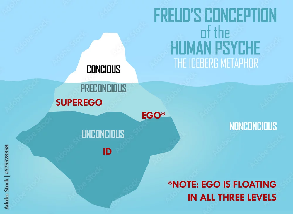 The iceberg model has three parts of the human psyche: an ego, an id, and a superego. This triple structure of the mind. The conscious is above water and unconscious on a surface