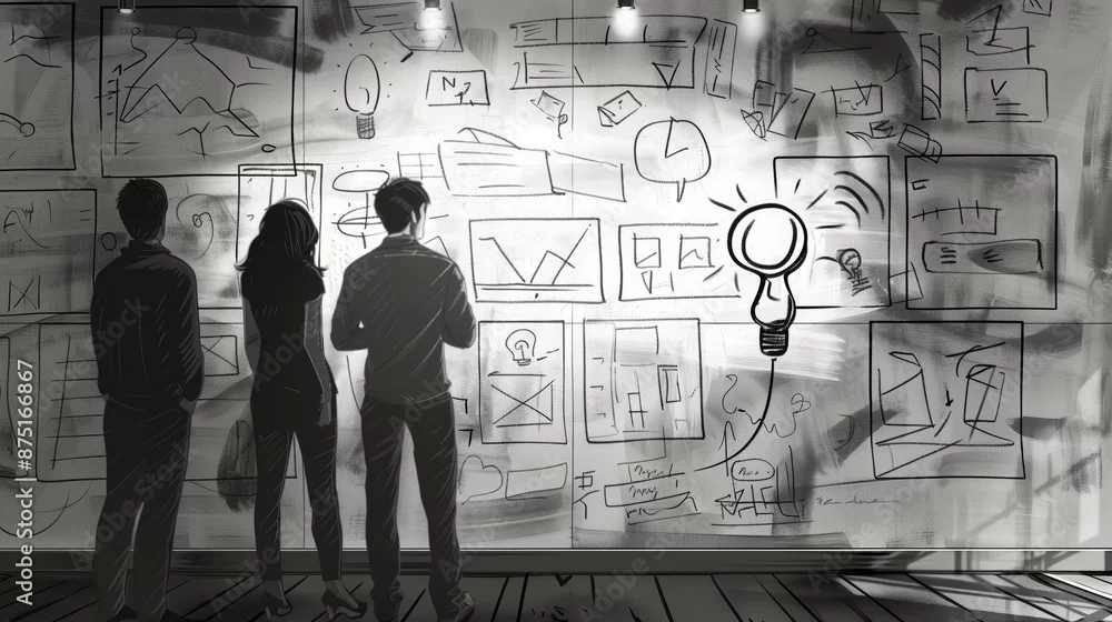 Black and white storyboard sketch of three people standing in front of a big board with lots of doodles and drawings on the wall generated AI