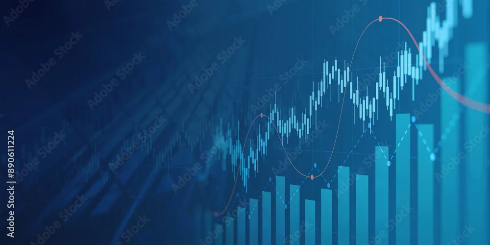 Financial graph with uptrend line and bar chart of stock market on blue color background