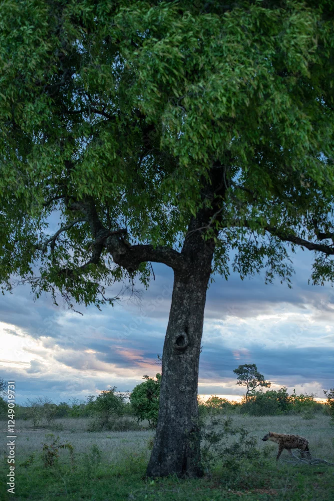 Hyena, Crocuta crocuta, against a backdrop of clouds at sunset.