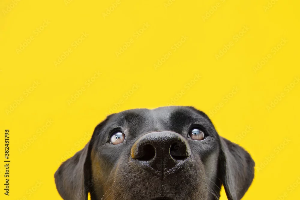 Close-up hide black labrador dog Isolated on yellow colored backgound.