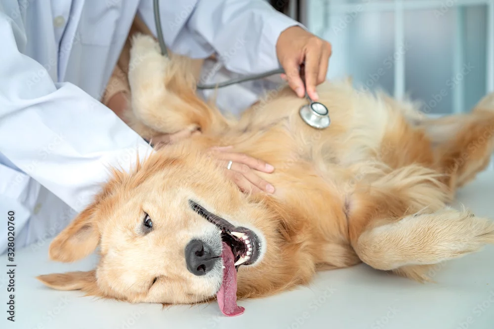 Veterinary concept. Veterinarian examining dog's heartbeat. Dog owners take pets, check the body with a veterinarian. The dog made a funny gesture when ...