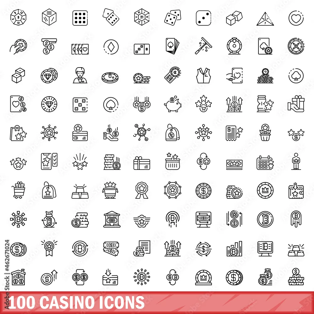 100 casino icons set. Outline illustration of 100 casino icons vector set isolated on white background