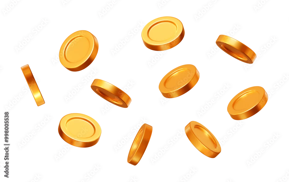 3d flying gold shiny coins on white isolated background. Rich or casino luck concept. Precious expensive treasure. Stock vector illustration.