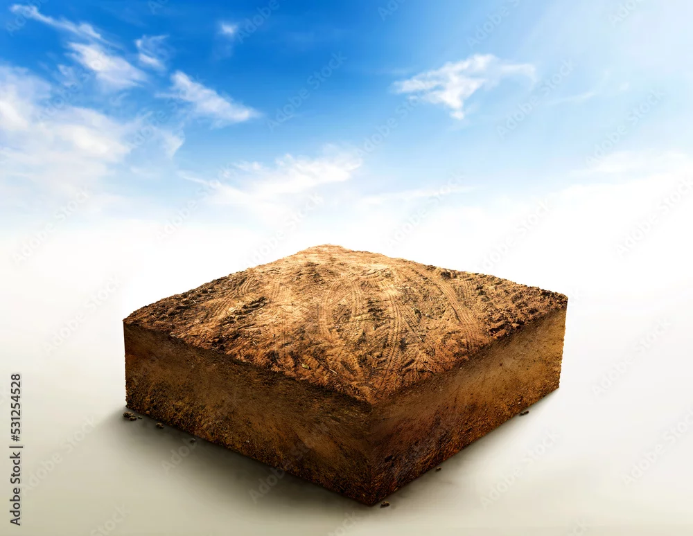 3D Illustration, cubical soil ground cross section with Empty dry soil, land plot for housing construction project, ground ecology, cutaway terrain floor with rock isolated on blue sky background.