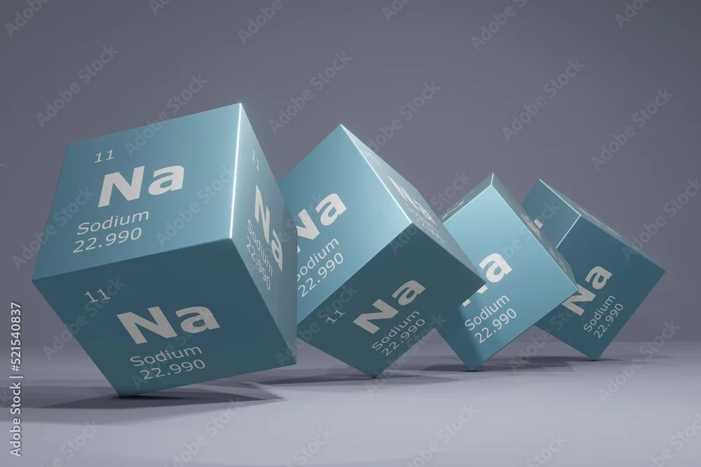 3D illustration of sodium, chemical element from the periodic table. Education, science and technology background