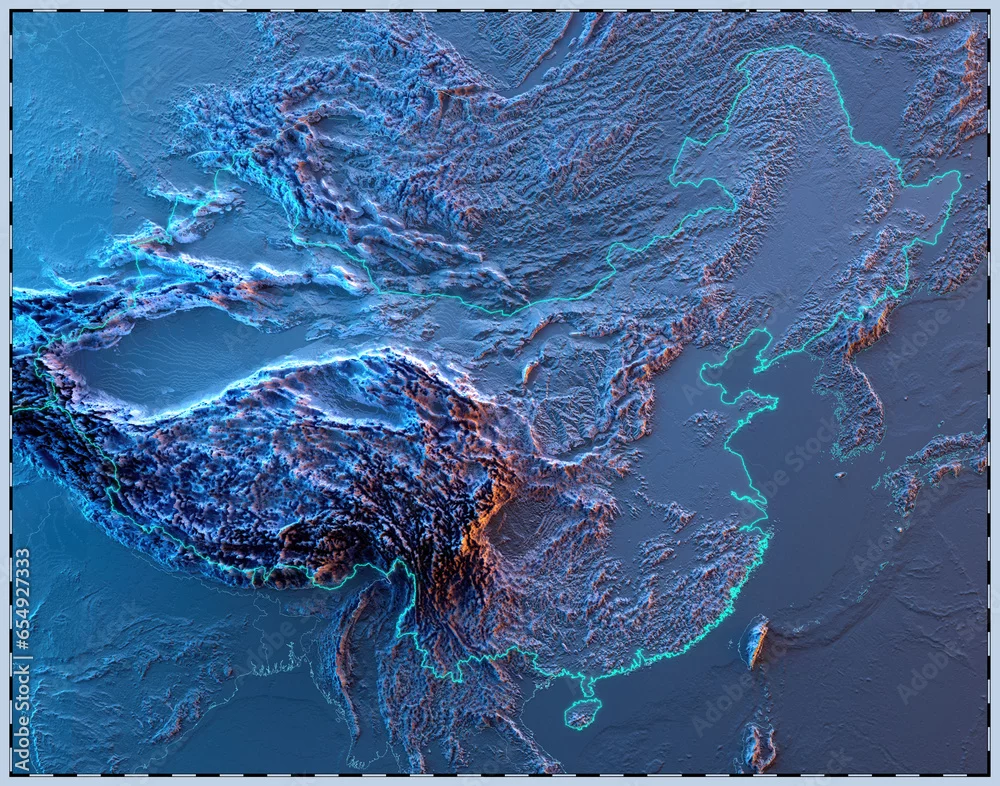 3D map of China with exaggerated topographic relief and borders. Detailed physical map of the People's Republic of China with Himalayas mountains. World ...
