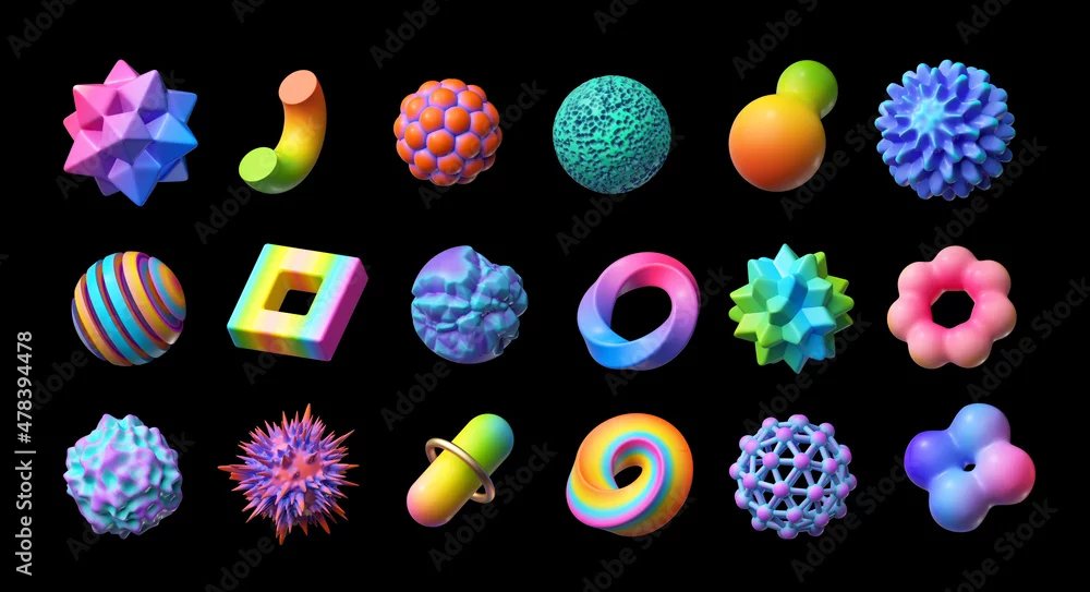 3d render. Set of abstract objects, geometric shapes, assorted signs and symbols, clip art isolated on black background.