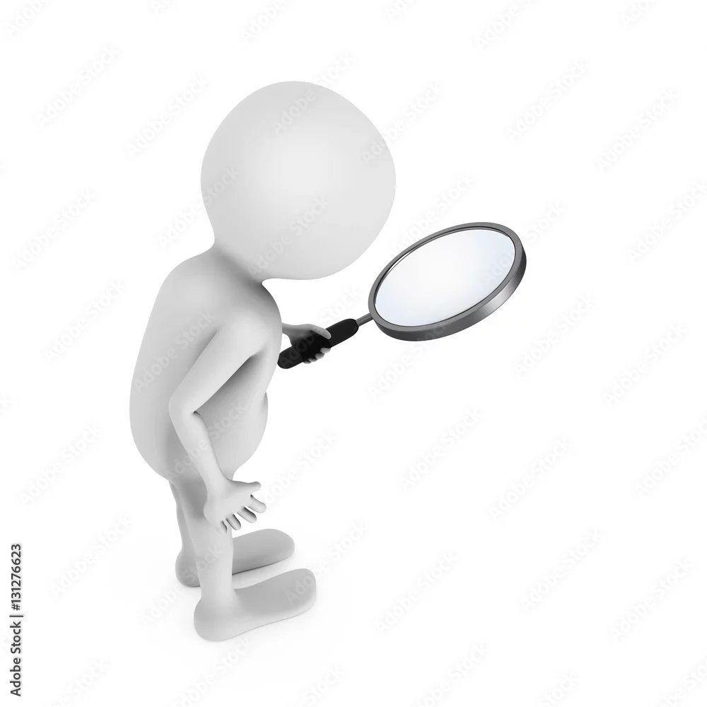 3D white man looking through the magnifying glass.