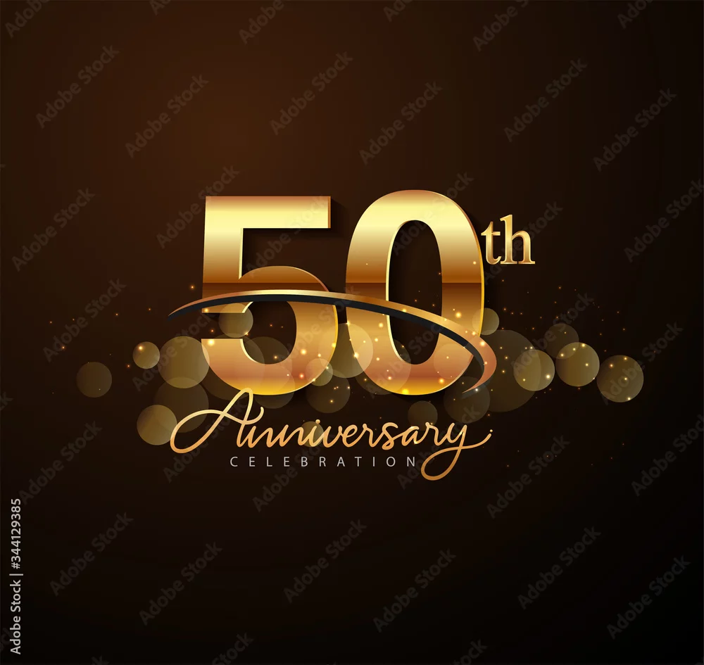 50th golden anniversary logo with swoosh and sparkle golden colored isolated on elegant background, vector design for greeting card and invitation ca ...