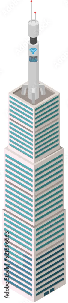 5G network technology. Base station, mobile data tower telecommunication signal transmitter, antenna on roof of skyscraper. Wifi connection equipment. Communication tower wireless high speed internet