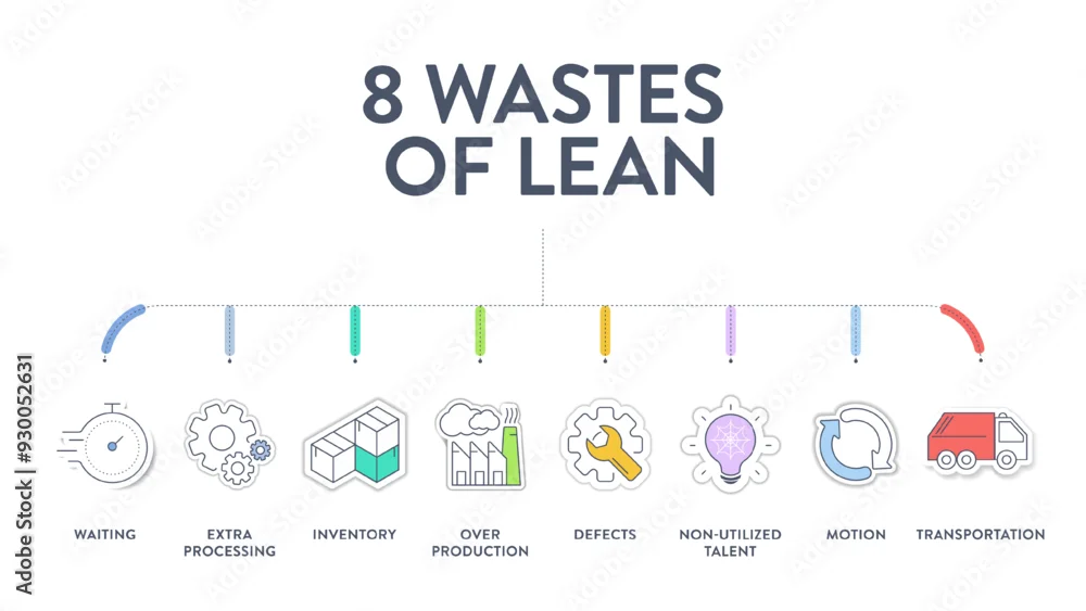 8 Wastes of lean manufacturing infographic presentation template with icons has 4 steps process such as non-utilize talent, waiting, transportation, inventory, motion, extra-processing, etc. Vector.