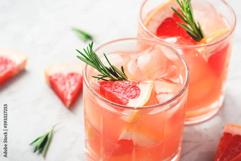 Refreshing grapefruit cocktail with ice and rosemary on a grey background.