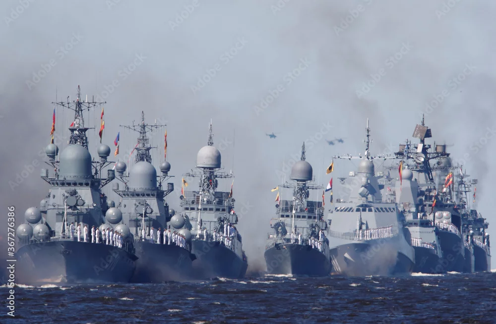 Russian warships sail during the Navy Day parade in Kronstadt