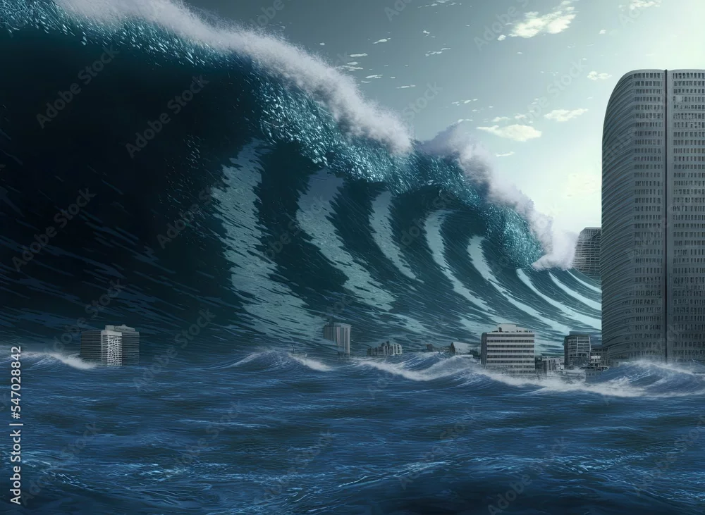 A 100-foot mega-tsunami striking a coastal city where tropical weather occurs as a result of climate change. Climate change has resulted in many natural disasters and tragedies.
