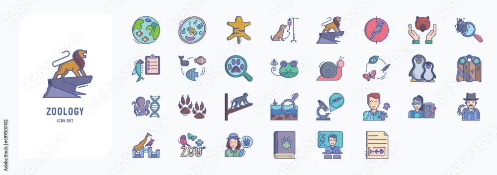 A collection sheet of linear color icons for Zoology, including icons like Animal cell, Animal, Birds, Ichthyology and more