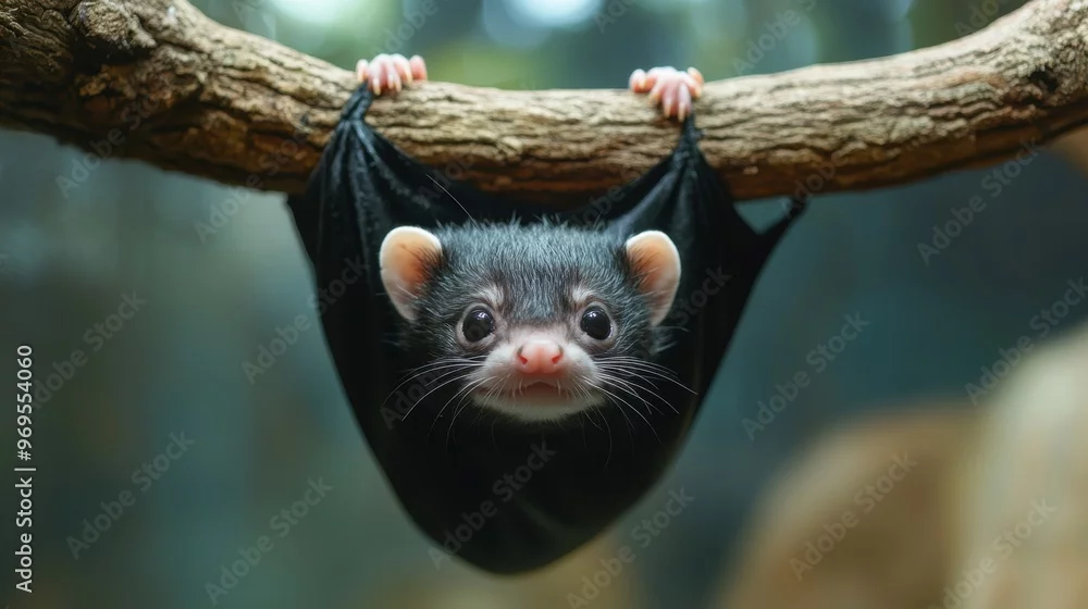 A cute animal hanging upside down from a branch, showcasing its expressive eyes and playful demeanor in a natural habitat.