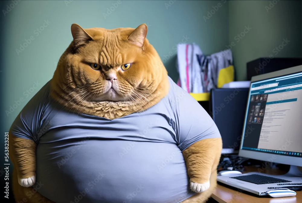 A fat cat is sitting at the office table in front of a computer. Sedentary lifestyle concept, generative ai