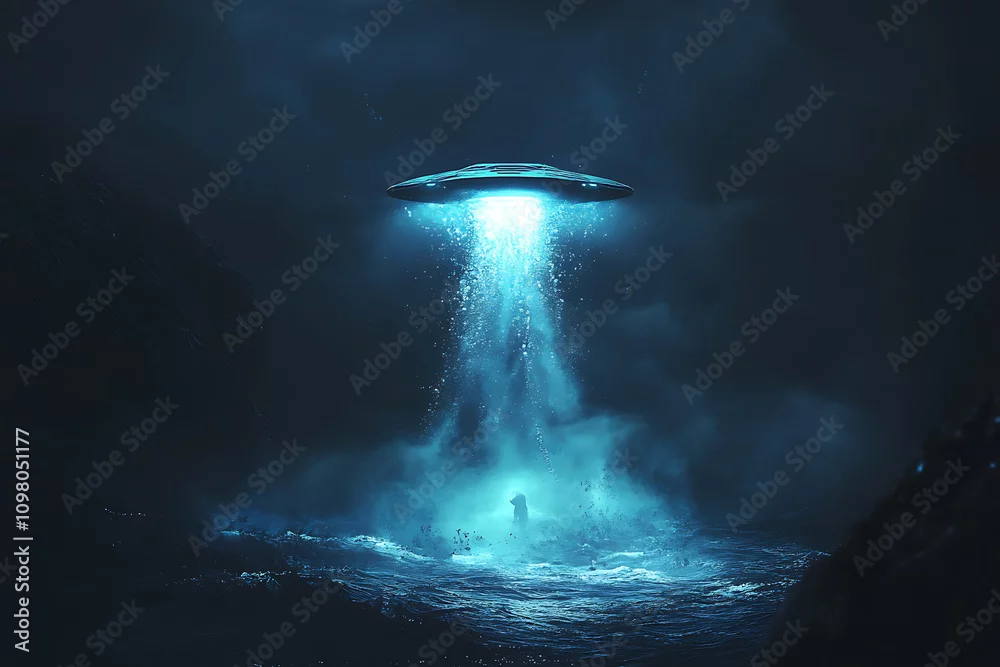 A glowing UFO dives into the ocean, creating splashes and illuminating the dark water, hinting at the presence of a secret underwater base.