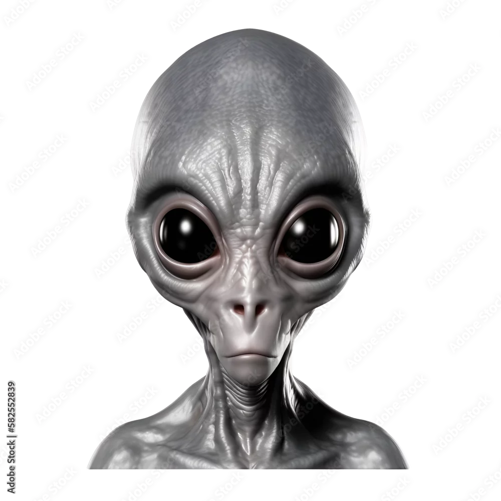 A grey alien with a large head and large eyes isolated on transparent background. Alien head.