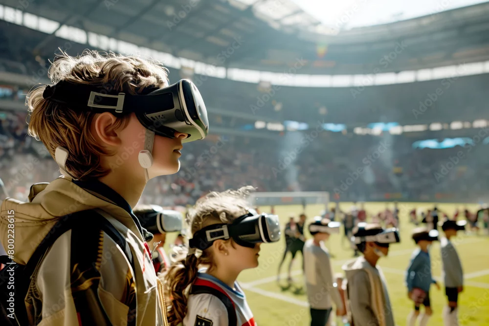 A group of children, wearing casual attire, stand on the sidelines of a football stadium, fully engaged in a virtual reality experience.