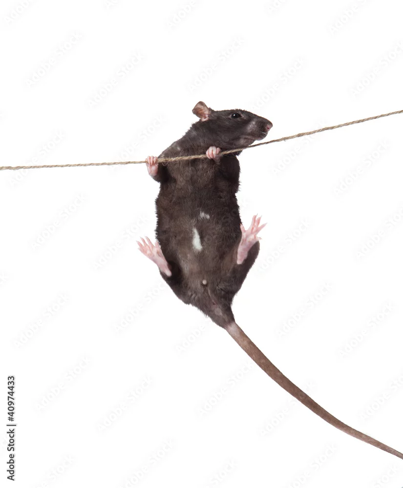 a rat crawling on a rope. rat clutching at rope on white backgro