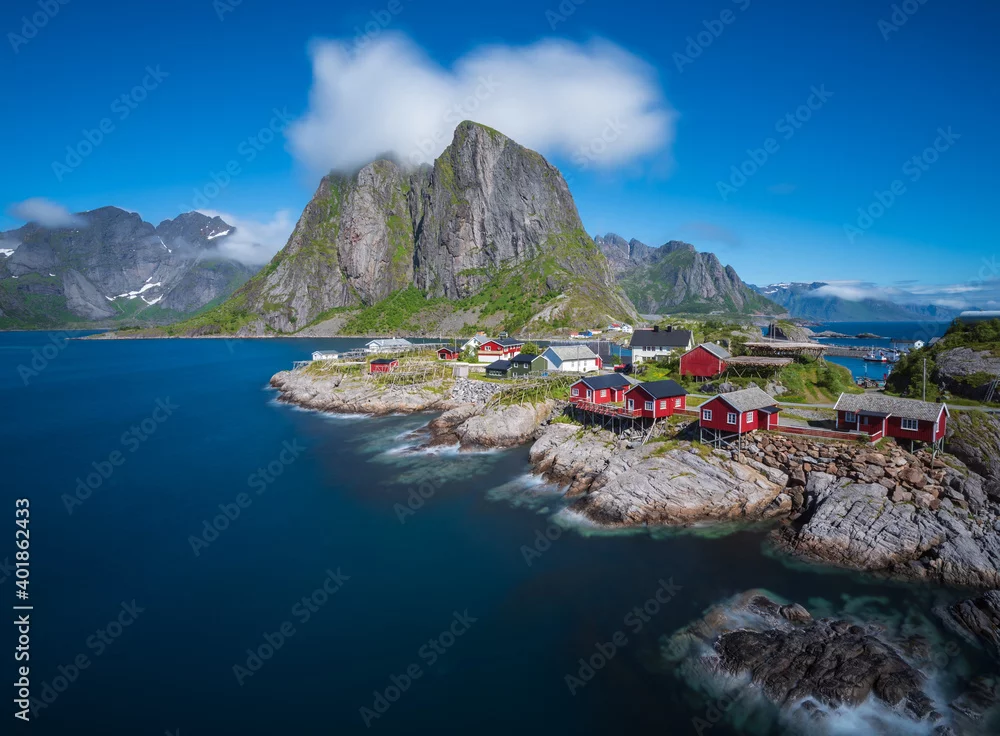 A small norway village with red houses and big mountain in the background with blue sky and white clouds