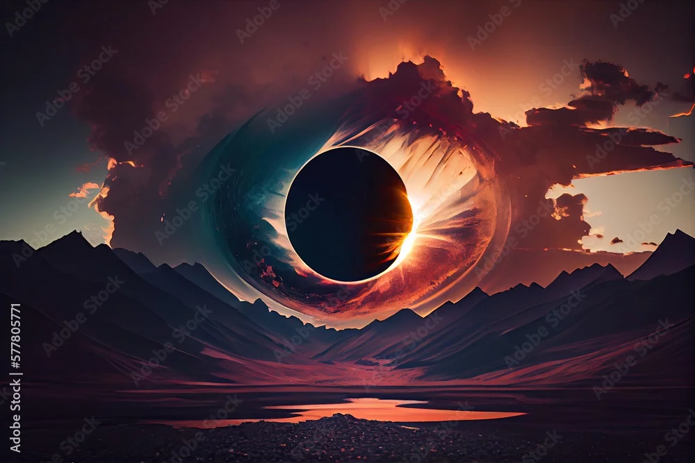 A solar eclipse, total eclipse with sun, moon and earth aligned, landscape background - generative ai