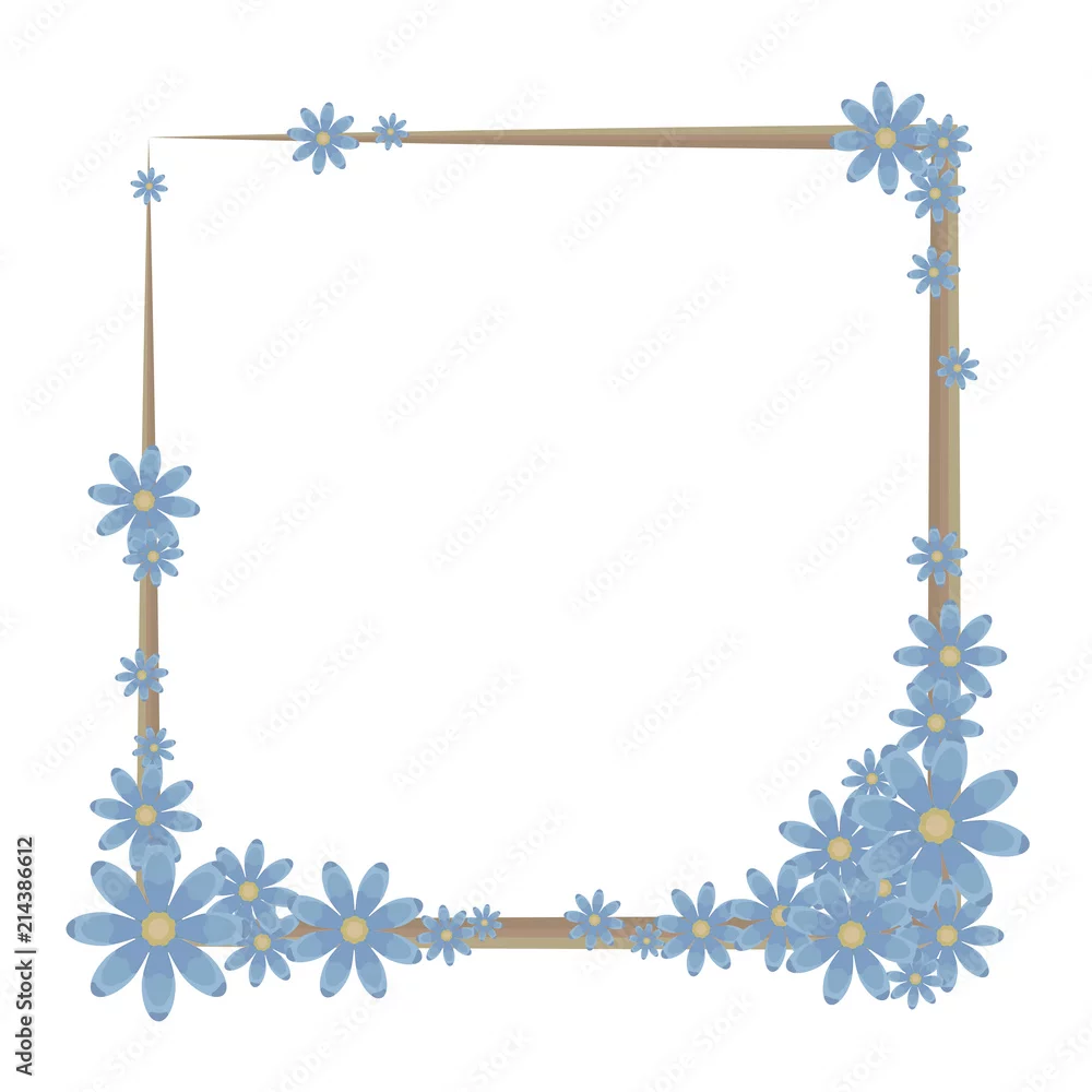 A square frame of a brown outline decorated with a composition of blue flowers with yellow middle vector object isolated on white background.