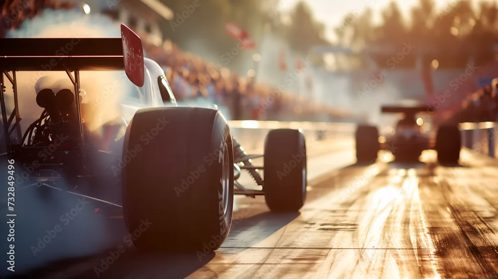 A vintage open-wheel race car performs a burnout on the track, with large slick tires and aerodynamic design, at a formula racing event, evoking the classic ...