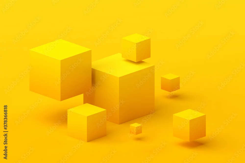 Abstract 3d render, geometric composition, yellow background design with cubes