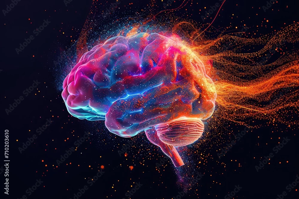 Abstract depiction features a noodle-like cortex, encephalon amidst fiery patterns, smoke, cosmic dust. Neurofeedback therapy, neurophobia, neurosecretion, ...
