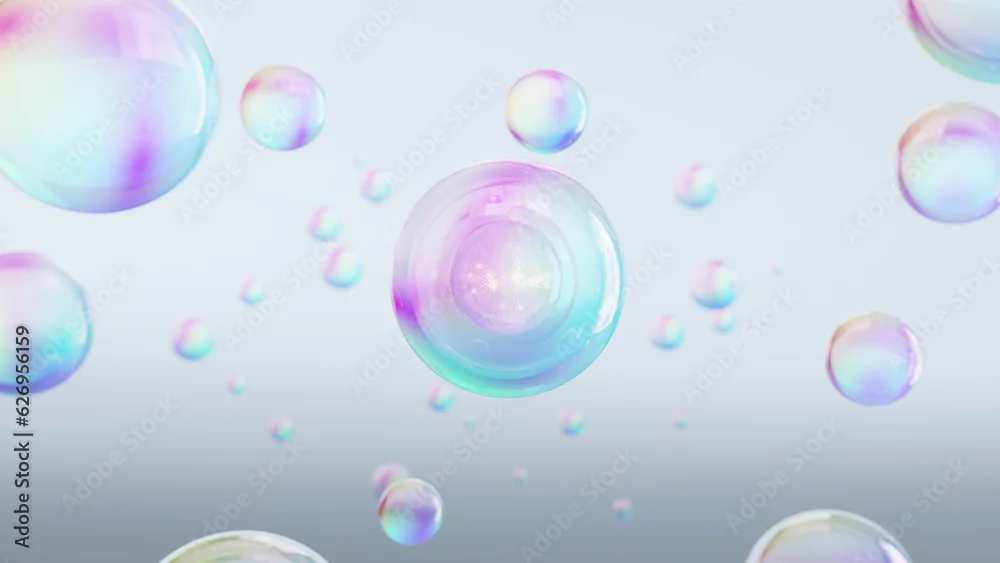 Abstract rendering with multicolor bubbles. Cosmetics illustration with a 3D bubble form combining foam bubbles, transparent balls, and holographic floating ...