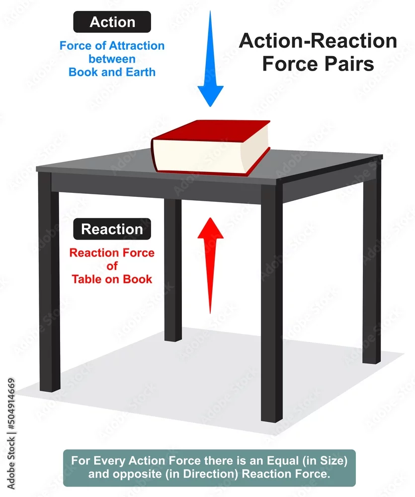Action reaction force pair infographic diagram example book on table gravity earth normal attraction equal size opposite direction for physics science ...